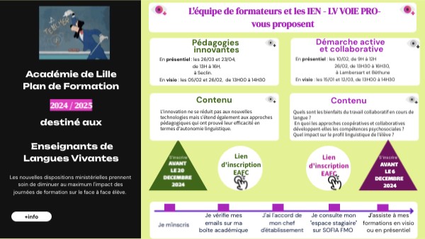 Le contenu explorera des approches innovantes, à la fois technologiques et didactiquesPrésentation d’un projet eTwining Ateliers pratiques - Mise en pratique de différentes approches pédagogiques. - Création de contenu. Études de cas : - Analyse de séquences d’apprentissage concrètes. - Partage d’expériences, échanges de pratiques