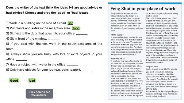 Does the writer of the text think the ideas 1–8 are good advice or bad advice? Choose and drag the 'good' or 'bad' boxes. 1) Work in a building on the side of a road. Bad 2) Put plants and sofas in the reception area. Good 3) Sit next to the door that goes into your office. ________ 4) Sit in front of the window. ________ 5) If you deal with finance, work in the south-east area of the room. ________ 6) Always show you are busy with lots of extra objects in your office. ________ 7) Have an object with water in the office. ________ 8) Only have objects for your job (e.g. pens, paper). ________