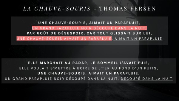 Une chauve-souris, aimait un parapluie,Un grand parapluie noir découpé dans la nuit,Par goût de désespoir, car tout glissait sur lui, une chauve-souris aimait un parapluie, aimait un parapluie