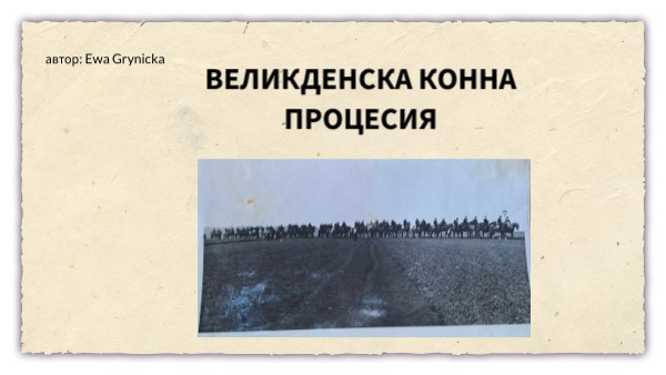 Авторът на разказа го е написал въз основа на интервю с г-жа Алина и г-н Рафал Магиера, собственици на конюшнята Остропа и организатори на великденското шествие.Снимките на конете са направени от г-н Марек Мишчишин. Сканирани архивни снимки на шествието от 50-те, 60-те и 70-те години на миналия век от частната колекция на г-н и г-жа Магиера ще бъдат добавени към историята на следващите страници.