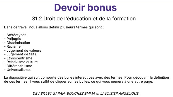 Dans ce travail nous allons définir plusieurs termes qui sont : - Stéréotypes - Préjugés - Discrimination - Racisme - Jugement de valeurs - Jugement de faits - Ethnocentrisme - Relativisme culturel - Différentialisme. - Universalisme. La diapositive qui suit comporte des bulles interactives avec des termes. Pour découvrir la définition de ces termes, il vous suffit de cliquer sur les bulles, ce qui vous mènera à une autre page.