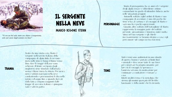 -Mario, il protagonista, ha 21 anni ed è sergente degli alpini, tenace e obbediente, ottimo comandante in grado di infondere fiducia anche nelle situazioni peggiori. -Antonelli, soldato aglid ordini di Mario e suo compagnio di avventure, è uno dei pochi che tiene testa al carisma e al coraggio di Mario e sarà uno fra i pochi sopravvissuti. -Giuanin, altro soldato ddl battaglione di Mario, rappresenta la maggior parte dei soldati presenti, giovanissimo e timoroso, nutre molta stima nel suo sergente e gli chiede incessantemente se faranno ritorno a casa; egli però muore sul campo ucciso dai russi.