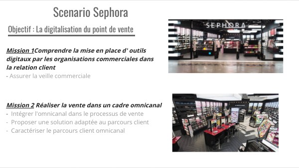 Vous souhaitez effectuer votre période de formation en milieu professionnel dans le secteur du commerce. Vous êtes attiré par le domaine du bien être à la personne. Votre attention se porte sur l'enseigne Sephora, spécialisée dans la vente de parfums et de produits cosmétiques. Afin de réussir votre entretien vous vous renseignez sur les méthodes de vente de l'enseigne, ses canaux de vente et sur les métiers pour lesquels vous pourriez postuler. Le magasin Sephora du centre commercial Val d'Europe a attiré votre attention. Vous vous rendez en magasin et observez les conseillères de vente.