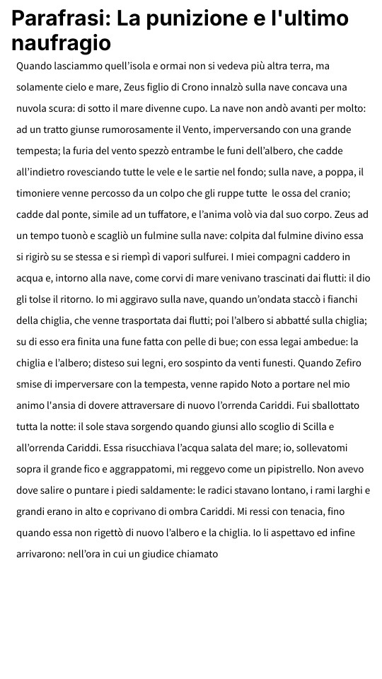 Quando lasciammo quell’isola e ormai non si vedeva più altra terra, ma solamente cielo e mare, Zeus figlio di Crono innalzò sulla nave concava una nuvola scura: di sotto il mare divenne cupo. La nave non andò avanti per molto: ad un tratto giunse rumorosamente il Vento, imperversando con una grande tempesta; la furia del vento spezzò entrambe le funi dell’albero, che cadde all’indietro rovesciando tutte le vele e le sartie nel fondo; sulla nave, a poppa, il timoniere venne percosso da un colpo che gli ruppe tutte le ossa del cranio; cadde dal ponte, simile ad un tuffatore, e l’anima volò via dal suo corpo. Zeus ad un tempo tuonò e scagliò un fulmine sulla nave: colpita dal fulmine divino essa si rigirò su se stessa e si riempì di vapori sulfurei. I miei compagni caddero in acqua e, intorno alla nave, come corvi di mare venivano trascinati dai flutti: il dio gli tolse il ritorno. Io mi aggiravo sulla nave, quando un’ondata staccò i fianchi della chiglia, che venne trasportata dai flutti; poi l’albero si abbatté sulla chiglia; su di esso era finita una fune fatta con pelle di bue; con essa legai ambedue: la chiglia e l’albero; disteso sui legni, ero sospinto da venti funesti. Quando Zefiro smise di imperversare con la tempesta, venne rapido Noto a portare nel mio animo l'ansia di dovere attraversare di nuovo l’orrenda Cariddi. Fui sballottato tutta la notte: il sole stava sorgendo quando giunsi allo scoglio di Scilla e all’orrenda Cariddi. Essa risucchiava l’acqua salata del mare; io, sollevatomi sopra il grande fico e aggrappatomi, mi reggevo come un pipistrello. Non avevo dove salire o puntare i piedi saldamente: le radici stavano lontano, i rami larghi e grandi erano in alto e coprivano di ombra Cariddi. Mi ressi con tenacia, fino quando essa non rigettò di nuovo l’albero e la chiglia. Io li aspettavo ed infine arrivarono: nell’ora in cui un giudice chiamato
