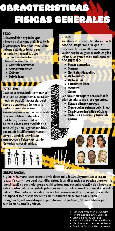 GRUPO RACIAL: El género humano se encuentra dividido en más de 30 subgrupos raciales con rasgos físicos y tipos genéticos diferentes. Estas diferencias se pueden observar, la identificación a partir del grupo racial se fundamenta en la relación de diferencias entre puntos del cráneo y de la pelvis, usando fórmulas de índice craneal y de índice pélvico. Otro método para identificar a las personas es el cerumen ya que existen dos tipos el seco que se encuentra normalmente en personas de origen mongoloide, y el húmedo que es poco frecuente en Japón, China y Siberia, pero común en Australia y África.