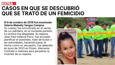 El 8 de octubre de 2019 fue asesinada Valeria Mabelly Vargas Campos Su cuerpo fue encontrado en el sector de La Ladrillera, en el noroeste porteño. La víctima fue degollada. Su esposo Jean Paúl Galarza Pisco, fue acusado planificar el asesinato, trató de burlar a las autoridades, haciendo pasar el hecho como un secuestro, fue detenido en junio de 2023 en Düren, Alemania. Contrató a matones para perpetrar la muertes de su esposa.