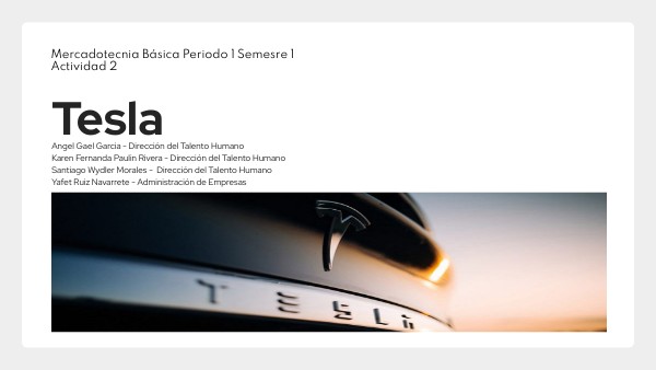 Diapositiva 4 informacion clave Pisano, G. P. (2020). Lessons from Tesla’s Approach to Innovation. Harvard Business Review. Recuperado de https://hbr.org/2020/02/lessons-from-teslas-approach-to-innovation Diapositiva 5: Fuentes de datos Almarza, O. (2018, julio 18). Por qué Tesla es la empresa con mayor cantidad de datos sobre conducción autónoma. Urban Tecno. https://www.mundodeportivo.com/urbantecno/motor/tesla-empresa-datos-conduccion-autonom Diapositiva 7 : Técnicas/métodos de contacto Evolv, A. I. (s/f). Tesla customer experience and customer journey touchpoints. Evolv.Ai. Recuperado el 15 de septiembre de 2024, de https://blog.evolv.ai/cx-lessons-from-teslas-customer-obsession Dapositiva 8: Plan de Muestreo - Robots.net. (2023, diciembre 21). How Tesla uses big data.
