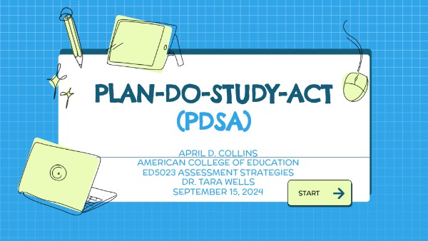The Plan-Do-Study-Act (PDSA) was developed by W. Edwards Deming to determine the effectiveness of assessments (American College of Education, 2024). The PDSA method is a structured approach for testing and improving changes by breaking tasks into steps, evaluating outcomes, making improvements, and then testing again. By using the PDSA, the cycle "seeks to identify a path to achieve the goal that will lead to improvement of a situation, and provide an evaluative method to document the level of improvement reached" (Daniel et. al, 2021, p; 155). This cycle helps to improve the learning experience for both students and educators.