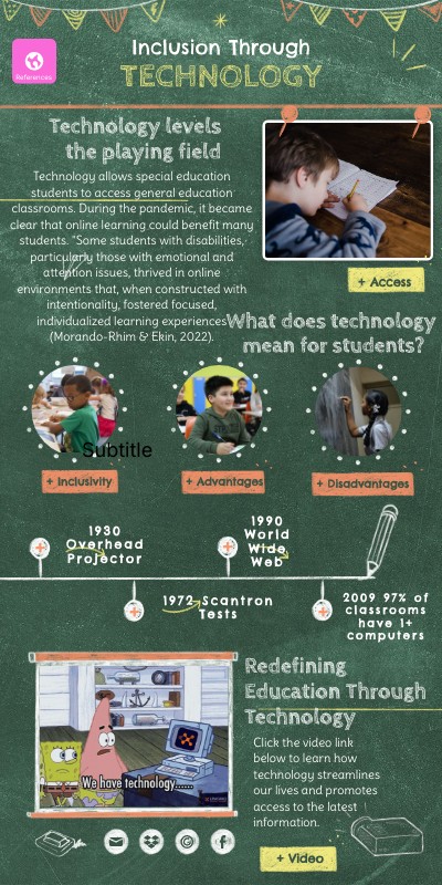 Brown, J. (2016, March 28). Redefining learning & teaching using technology [Video]. TEDxNorwichED. https://www.youtube.com/watch?v=AOTEQVYDPpgMorando-Rhim, L., & Ekin, S. (2022, August 16). How has the pandemic affected students with disabilities? A review of the evidence to date. Center on Reinventing Public Education. Retrieved September 23, 2022, from https://crpe.org/how-has-the-pandemic-affected-students-with-disabilities-a-review-of-the-evidence-to-date/Nepo, K. (2017). The use of technology to improve education. Child & Youth Forum, 46(2), 207-221.Purdue University College of Education. (2024, January). The evolution of technology in the classroom. Purdue University. https://education.purdue.edu/2024/01/the-evolution-of-technology-in-the-classroom/