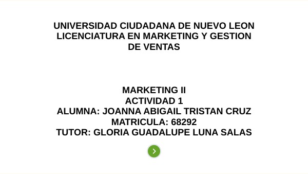MARKETING II ACTIVIDAD 1 ALUMNA: JOANNA ABIGAIL TRISTAN CRUZ MATRICULA: 68292 TUTOR: GLORIA GUADALUPE LUNA SALAS