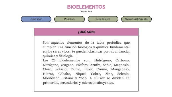 Son aquellos elementos de la tabla periódica que cumplen una función biológica y química fundamental en los seres vivos. Se pueden clasificar por: abundancia, química y fisiología.Los 23 bioelementos son: Hidrógeno, Carbono, Nitrógeno, Oxígeno, Fósforo, Azufre, Sodio, Magnesio, Cloro, Potasio, Calcio, Flúor, Cromo, Manganeso, Hierro, Cobalto, Níquel, Cobre, Zinc, Selenio, Molibdeno, Estaño y Yodo. A su vez se dividen en primarios, secundarios y microconstituyentes.