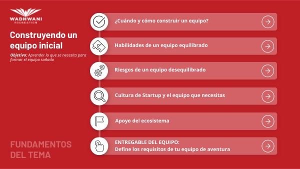 Es posible que necesites construir tu equipo central a medida que tu producto/servicio alcance el ajuste del mercado y comiences a expandirte. Antes de esa etapa, el equipo fundador, mentores y asesores con el apoyo de trabajadores independientes deberían ser suficientes. Cuando comiences a construir el equipo central, busca lo siguiente: Habilidades y Experiencia: Contrata individuos con las habilidades necesarias para desarrollar tu producto o servicio. La versatilidad es clave, ya que los primeros miembros del equipo a menudo desempeñan múltiples roles. Ajuste Cultural: Asegúrate de que los miembros del equipo se alineen con la cultura y los valores de la startup. Una cultura positiva y colaborativa fomenta la innovación y la motivación. Adaptabilidad y Mentalidad de Crecimiento: Las startups evolucionan rápidamente, por lo que los miembros del equipo fundador deben ser adaptables y estar dispuestos a aprender y crecer con la empresa.