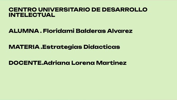 CENTRO UNIVERSITARIO DE DESARROLLO INTELECTUAL ALUMNA . Floridami Balderas Alvarez MATERIA .Estrategias Didacticas DOCENTE.Adriana Lorena Martinez
