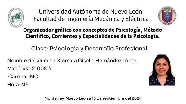 Organizador gráfico con conceptos de Psicología, Método Científico, Corrientes y Especialidades de la Psicología.