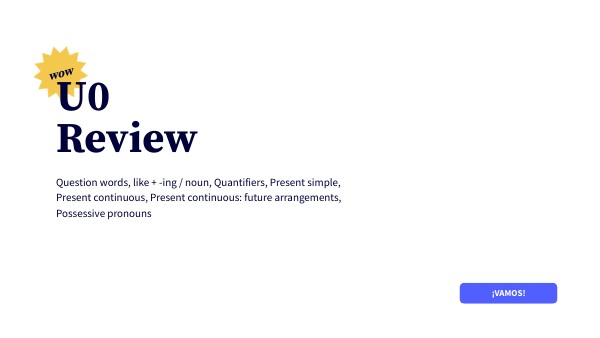 Question words, like + -ing / noun, Quantifiers, Present simple, Present continuous, Present continuous: future arrangements, Possessive pronouns
