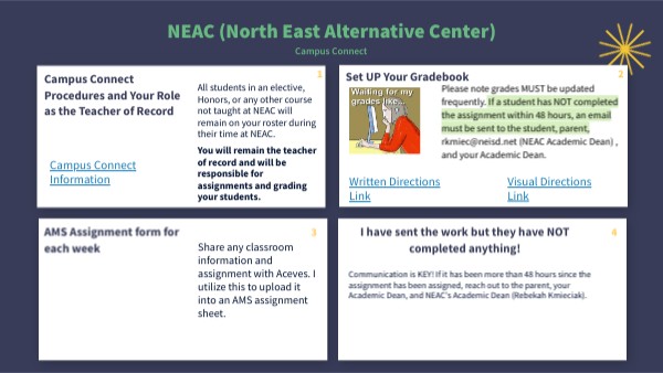 All students in an elective, Honors, or any other course not taught at NEAC will remain on your roster during their time at NEAC. You will remain the teacher of record and will be responsible for assignments and grading your students.