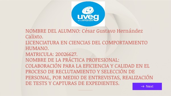 NOMBRE DEL ALUMNO: César Gustavo Hernández Calixto. LICENCIATURA EN CIENCIAS DEL COMPORTAMIENTO HUMANO. MATRICULA: 20026627. NOMBRE DE LA PRÁCTICA PROFESIONAL: COLABORACIÓN PARA LA EFICIENCIA Y CALIDAD EN EL PROCESO DE RECLUTAMIENTO Y SELECCIÓN DE PERSONAL, POR MEDIO DE ENTREVISTAS, REALIZACIÓN DE TESTS Y CAPTURAS DE EXPEDIENTES.