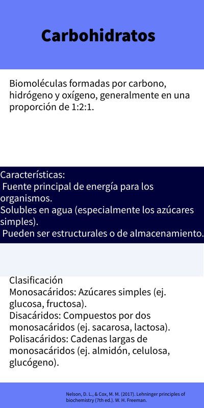 Características: Fuente principal de energía para los organismos. Solubles en agua (especialmente los azúcares simples). Pueden ser estructurales o de almacenamiento.