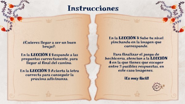 ¿Quieres llegar a ser un buen brujo?: En la LECCIÓN 1 Responde a las preguntas correctamente, para llegar al final del camino. En la LECCIÓN 2 Acierta la letra correcta para conseguir la próxima adivinanza.
