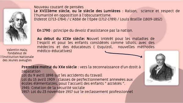 En 1790 : principe du devoir d’assistance par la nation. Au début du XIXe siècle: Nouvel intérêt pour les maladies de l’esprit et pour les enfants considérés comme idiots, avec des médecins et des éducateurs ( Esquirol, nouvelles méthodes médico-éducatives)