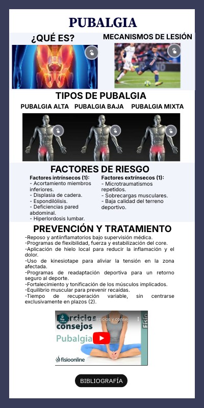 1- Gal, C. (2001). La Pubalgia: Prevención y Tratamiento. Editorial Paidotribo. 2- Romero, M. A. (2013). Pubalgia: Qué es, síntomas y tratamiento. Top Doctors. https://www.topdoctors.es/diccionariomedico/pubalgia 3- Thorborg, K., Reiman, M. P., Weir, A., Kemp, J. L., Serner, A., Mosler, A. B., & HÖlmich, P. (2018). Clinical Examination, Diagnostic Imaging, and Testing of Athletes With Groin Pain: An Evidence-Based Approach to Effective Management. The Journal of Orthopaedic and Sports Physical Therapy, 48(4), 239-249. https://doi.org/10.2519/jospt.2018.7850 4- Zoga, A. C., Mullens, F. E., & Meyers, W. C. (2010). The Spectrum of MR Imaging in Athletic Pubalgia. Radiologic Clinics, 48(6), 1179-1197.