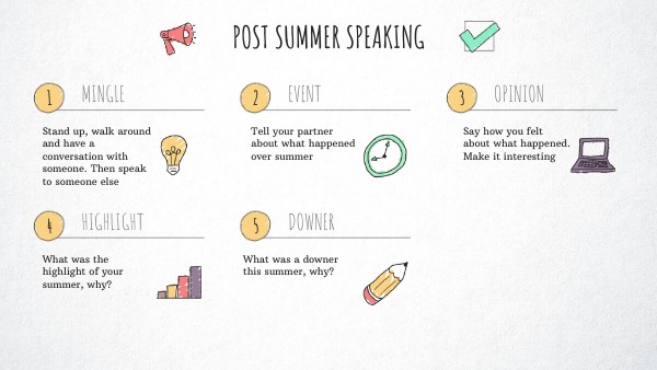 Tell your partner about what happened over summer. Remember to ask questions!