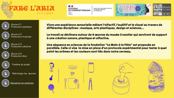 Vivre une expérience sensorielle mêlant l’olfactif, l’auditif et le visuel au travers de différentes disciplines : musique, arts plastiques, design et sciences… Le travail se déclinera autour de 4 œuvres du musée Crozatier qui serviront de support à une création sonore, plastique et olfactive. Une séquence en sciences de la fondation "La Main à la Pâte" est proposée en parallèle. Celle-ci vise la mise en place d'un protocole expérimental pour tester à quel point les arômes et les couleurs sont liés dans notre cerveau.