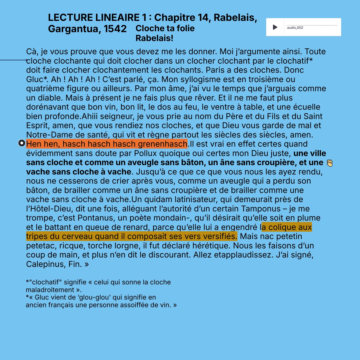 Cà, je vous prouve que vous devez me les donner. Moi j’argumente ainsi. Toute cloche clochante qui doit clocher dans un clocher clochant par le clochatif* doit faire clocher clochantement les clochants. Paris a des cloches. Donc Gluc*. Ah ! Ah ! Ah ! C’est parlé, ça. Mon syllogisme est en troisième ou quatrième figure ou ailleurs. Par mon âme, j’ai vu le temps que j’arguais comme un diable. Mais à présent je ne fais plus que rêver. Et il ne me faut plus dorénavant que bon vin, bon lit, le dos au feu, le ventre à table, et une écuelle bien profonde.Ahiii seigneur, je vous prie au nom du Père et du Fils et du Saint Esprit, amen, que vous rendiez nos cloches, et que Dieu vous garde de mal et Notre-Dame de santé, qui vit et règne partout les siècles des siècles, amen. Hen hen, hasch hasch hasch grenenhasch.Il est vrai en effet certes quand évidemment sans doute par Pollux quoique oui certes mon Dieu juste, une ville sans cloche et comme un aveugle sans bâton, un âne sans croupière, et une vache sans cloche à vache. Jusqu’à ce que ce que vous nous les ayez rendu, nous ne cesserons de crier après vous, comme un aveugle qui a perdu son bâton, de brailler comme un âne sans croupière et de brailler comme une vache sans cloche à vache.Un quidam latinisateur, qui demeurait près de l’Hôtel-Dieu, dit une fois, alléguant l’autorité d’un certain Tamponus – je me trompe, c’est Pontanus, un poète mondain-, qu’il désirait qu’elle soit en plume et le battant en queue de renard, parce qu’elle lui a engendré la colique aux tripes du cerveau quand il composait ses vers versifiés. Mais nac petetin petetac, ricque, torche lorgne, il fut déclaré hérétique. Nous les faisons d’un coup de main, et plus n’en dit le discourant. Allez etapplaudissez. J’ai signé, Calepinus, Fin. »