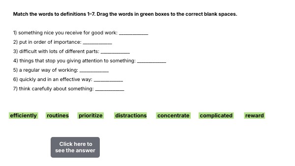 Match the words to definitions 1–7. Drag the words in green boxes to the correct blank spaces. 1) something nice you receive for good work: _____________ 2) put in order of importance: _____________ 3) difficult with lots of different parts: _____________ 4) things that stop you giving attention to something: _____________ 5) a regular way of working: _____________ 6) quickly and in an effective way: _____________ 7) think carefully about something: _____________