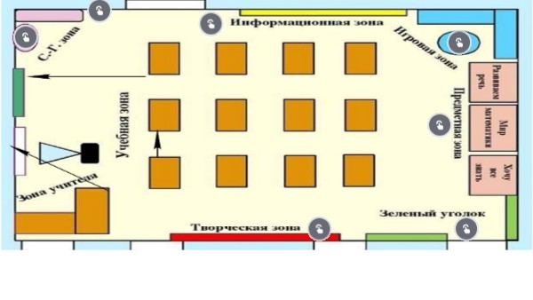 В игровую зону кабинета начальных классов могут входить следующие элементы: 1 Мягкая мебель (диван и кресла). 2 Журнальный столик. 3 Детские игрушки и игры. Игровая зона предназначена для отдыха детей и ощущения ими домашнего уюта. Она благоприятно влияет на общий тонус ребёнка, способствует тренировке подвижности нервных процессов, создаёт положительный настрой и снимает психоэмоциональное напряжение.