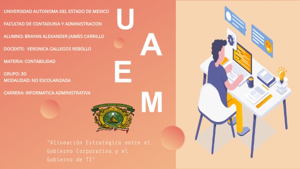 UNIVERSIDAD AUTONOMA DEL ESTADO DE MEXICO FACULTAD DE CONTADURIA Y ADMINISTRACION ALUMNO: BRAYAN ALEXANDER JAIMES CARRILLO DOCENTE: VERONICA GALLEGOS REBOLLO MATERIA: CONTABILIDAD GRUPO: 3D MODALIDAD: NO ESCOLARIZADA CARRERA: INFORMATICA ADMINISTRATIVA