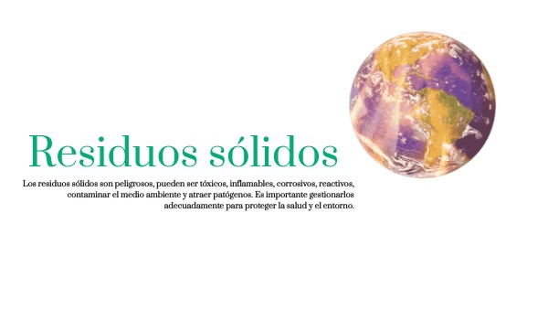 Los residuos sólidos son un problema ambiental y de salud pública que afecta a todos los países del mundo. Se generan en hogares, industrias, comercios y actividades cotidianas, representando un desafío para la gestión sostenible de los recursos. Esta presentación explora el concepto de residuos sólidos, su clasificación y tratamiento, así como su impacto negativo en el medio ambiente y la salud humana.