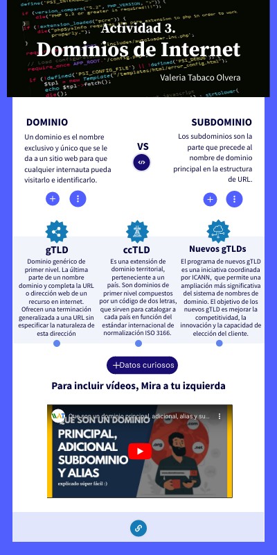Comunicación. (2022, 13 enero). Dominios y subdominios, qué son y en qué se diferencian - Domini .barcelona. Domini .Barcelona. https://www.domini.barcelona/es/actualitat/dominios-y-subdominios-que-son-y-en-que-se-diferencian/ Content, R. R. (2022, 8 diciembre). ¿Qué es un dominio en Internet? Rock Content - ES. https://rockcontent.com/es/blog/que-es-un-dominio/ Información básica sobre los nuevos gTLD. (2015, diciembre). ICANN. https://newgtlds.icann.org/sites/default/files/fast-facts-22dec15-es.pdf ¿Qué es un gTLD? (s. f.). OVHcloud. https://www.ovhcloud.com/es/learn/what-is-gtld/ Infante, D. C. H., & Infante, D. C. H. (2023, 6 diciembre). ¿Qué es un subdominio? Una guía completa para principiantes. Tutoriales Hostinger. https://www.hostinger.mx/tutoriales/que-es-un-subdominio#%C2%BFCual_es_un_ejemplo_de_subdominio Sl, S. C. I. (s. f.). CCTLD - DonDominio. DonDominio. https://www.dondominio.com/es/help/213/cctld/