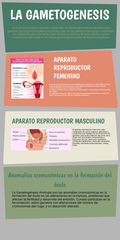 La Gametogénesis Anómala son las anomalías cromosómicas en la formación del óvulo en las alteraciones en la meiosis, problemas que afectan la fertilidad y desarrollo del embrión. Cunado participan en la fecundación, estos gametos con alteraciones del número de cromosomas dan lugar a un desarrollo alterado