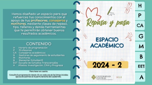 H Horario de programación P Profesores CA Consejeros académicos G Gestores de seguimiento de estudiantes M Monitores B Bienestar Estudiantil EET Escuela de Estudios Transversales A Aliados: Investigación, CRAI y Progresa