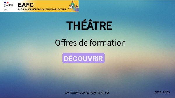 A titre informatif, pour le volet à public désigné: - un temps de formation pour accompagner les équipes de lycée (enseignements optionnel et de spécialité dans l’appropriation des programmes limitatifs du baccalauréat pour la session 2025) et de CHAT en collège) , - un accompagnement pour valoriser leurs compétences dans le cadre de la préparation à la certification complémentaire de théâtre (participation liée à l'inscription à cette épreuve de certification).