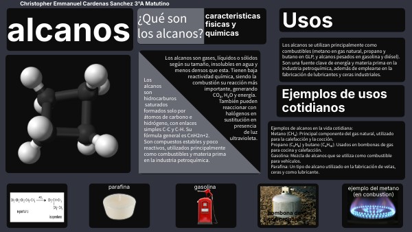 Ejemplos de alcanos en la vida cotidiana: Metano (CH₄): Principal componente del gas natural, utilizado para la calefacción y la cocción. Propano (C₃H₈) y butano (C₄H₁₀): Usados en bombonas de gas para cocina y calefacción. Gasolina: Mezcla de alcanos que se utiliza como combustible para vehículos. Parafina: Un tipo de alcano utilizado en la fabricación de velas, ceras y como lubricante.