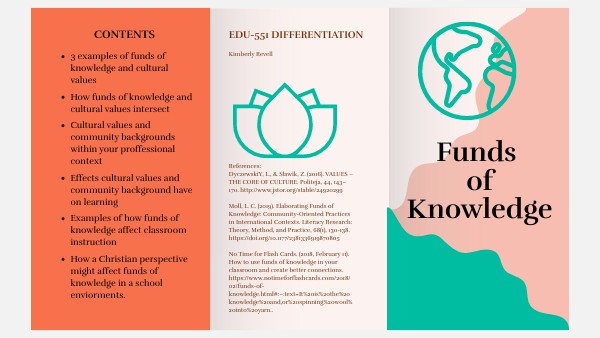 Kimberly Revell References: DyczewskiY, L., & Sławik, Z. (2016). VALUES – THE CORE OF CULTURE. Politeja, 44, 143–170. http://www.jstor.org/stable/24920299 Moll, L. C. (2019). Elaborating Funds of Knowledge: Community-Oriented Practices in International Contexts. Literacy Research: Theory, Method, and Practice, 68(1), 130-138. https://doi.org/10.1177/2381336919870805 No Time for Flash Cards. (2018, February 11). How to use funds of knowledge in your classroom and create better connections. https://www.notimeforflashcards.com/2018/02/funds-of-knowledge.html#:~:text=It%20is%20the%20knowledge%20and,or%20spinning%20wool%20into%20yarn..