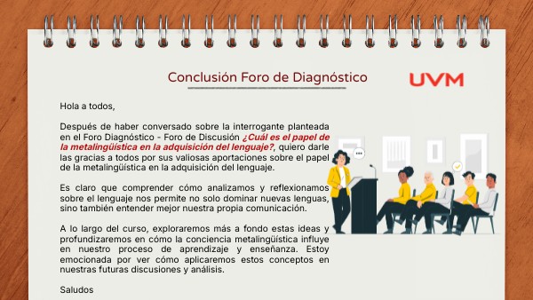 Hola a todos, Después de haber conversado sobre la interrogante planteada en el Foro Diagnóstico - Foro de Discusión ¿Cuál es el papel de la metalingüística en la adquisición del lenguaje?, quiero darle las gracias a todos por sus valiosas aportaciones sobre el papel de la metalingüística en la adquisición del lenguaje. Es claro que comprender cómo analizamos y reflexionamos sobre el lenguaje nos permite no solo dominar nuevas lenguas, sino también entender mejor nuestra propia comunicación. A lo largo del curso, exploraremos más a fondo estas ideas y profundizaremos en cómo la conciencia metalingüística influye en nuestro proceso de aprendizaje y enseñanza. Estoy emocionada por ver cómo aplicaremos estos conceptos en nuestras futuras discusiones y análisis. Saludos