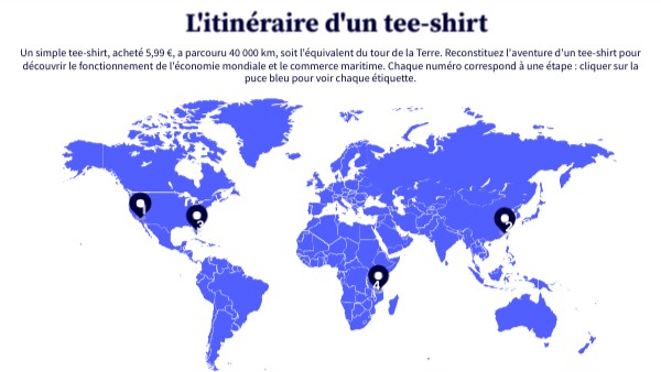 Un simple tee-shirt, acheté 5,99 €, a parcouru 40 000 km, soit l'équivalent du tour de la Terre. Reconstituez l'aventure d'un tee-shirt pour découvrir le fonctionnement de l'économie mondiale et le commerce maritime. Chaque numéro correspond à une étape : cliquer sur la puce bleu pour voir chaque étiquette.