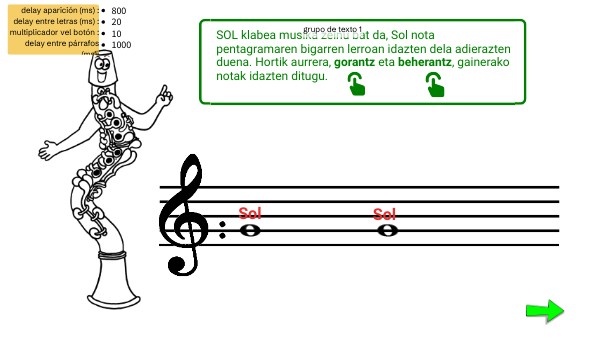 Ikusi nola margotzen den lehenengo irudian. Gero, pausoka ikusteko egin sol klabearen gainean klik egin lau pausoak ikusi arte.