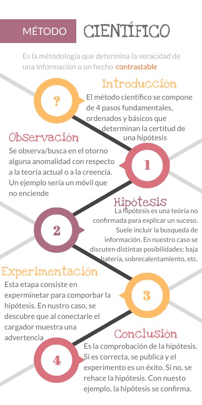 El método científico se compone de 4 pasos fundamentales, ordenados y básicos que