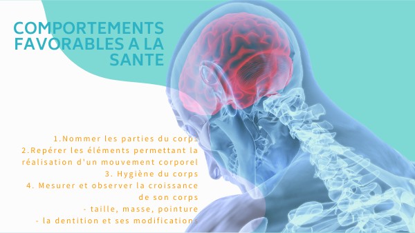 1.Nommer les parties du corps 2.Repérer les éléments permettant la réalisation d'un mouvement corporel 3. Hygiène du corps 4. Mesurer et observer la croissance de son corps - taille, masse, pointure - la dentition et ses modifications