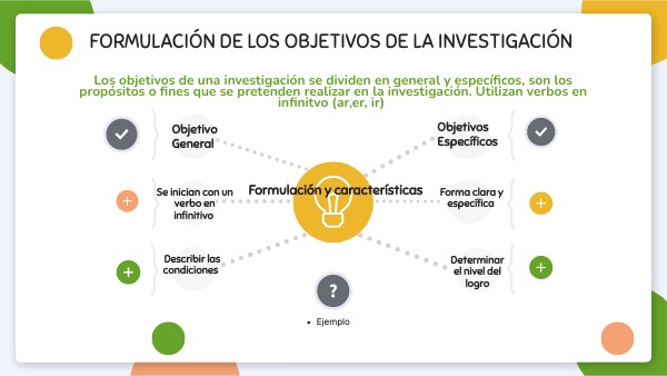 Los objetivos de una investigación se dividen en general y específicos, son los propósitos o fines que se pretenden realizar en la investigación. Utilizan verbos en infinitvo (ar,er, ir)