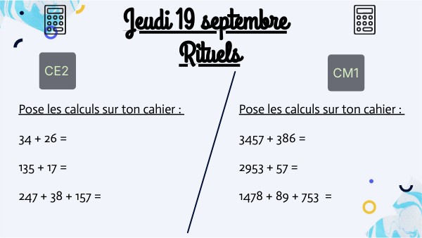 Pose les calculs sur ton cahier : 34 + 26 = 135 + 17 = 247 + 38 + 157 =