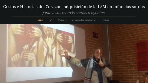 Historias y gestos del corazón, proyecto transmedia con un mundo narrativo y afectivo que surge de procesos de investigación etnográfica junto a personas y en territorio digital. De ida y vuelta se lleva el contenido digital al espacio físico con una instalación sensorial y poética, para la adquisición de la lengua de señas mexicana en la primera infancia de bebés sordos, sordas. -En el entorno web se pone en acceso 2 Webdocs interactivos en LSM, con experiencias en primera persona desde: 1) la resistencia de mujeres sordas y mujeres oyentes que son madres de bebés sordos, sus experiencias de atención - frente a la desatención con instituciones como la familia o de salud, hasta llegar a 2) la adquisición de la lengua. -Y como un llamado a la acción para profesionales en salud/educación y familia oyente de bebés sordos, el entorno web lanza actividades de reflexión y discusión desde tik tok, así como participación juegos con decisiones a partir de distintos roles. -Materiales de mano, tal como sucedía en México S.XIX con alfabetos de Francia