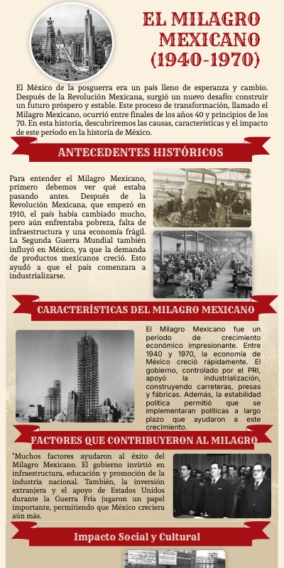 Para entender el Milagro Mexicano, primero debemos ver qué estaba pasando antes. Después de la Revolución Mexicana, que empezó en 1910, el país había cambiado mucho, pero aún enfrentaba pobreza, falta de infraestructura y una economía frágil. La Segunda Guerra Mundial también influyó en México, ya que la demanda de productos mexicanos creció. Esto ayudó a que el país comenzara a industrializarse.