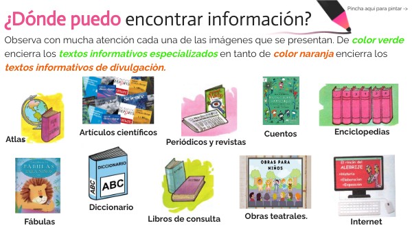Observa con mucha atención cada una de las imágenes que se presentan. De color verde encierra los textos informativos especializados en tanto de color naranja encierra los textos informativos de divulgaciòn.