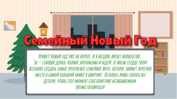 Привет! Новый год уже на пороге, и в воздухе витает волшебство. Ты — старшая дочка, полная энтузиазма и идей. В твоем сердце горит желание создать самое прекрасное семейное фото, которое займет почетное место в самой большой рамке в квартире. Осталось лишь собрать все детали, чтобы этот момент стал поистине незабываемым. Время готовиться!