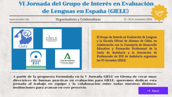 El Grupo de Interés en Evaluación de Lenguas y la Escuela Oficial de idiomas de Cádiz, en colaboración con la Consejería de Desarrollo Educativo y Formación Profesional de la Junta de Andalucía y la Asociación de Profesorado de EOI de Andalucía organizan las VI Jornadas GIELE.